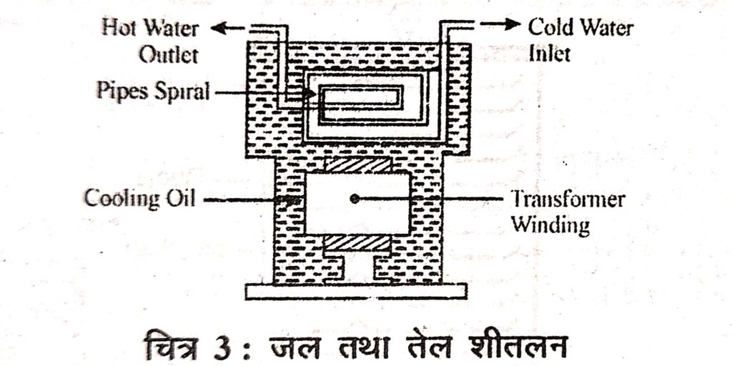 Transformers of higher capacity (KVA) are water cooled. The tank in these is large. Water pipes are wrapped around the winding (sometimes pipes are installed in the upper part as shown in the picture, the tank below is filled with oil. To cool the hot oil, the coolness of the water tube keeps it cool. Cold water is sent into the pipe from one end and the water is heated and comes out from the other end.